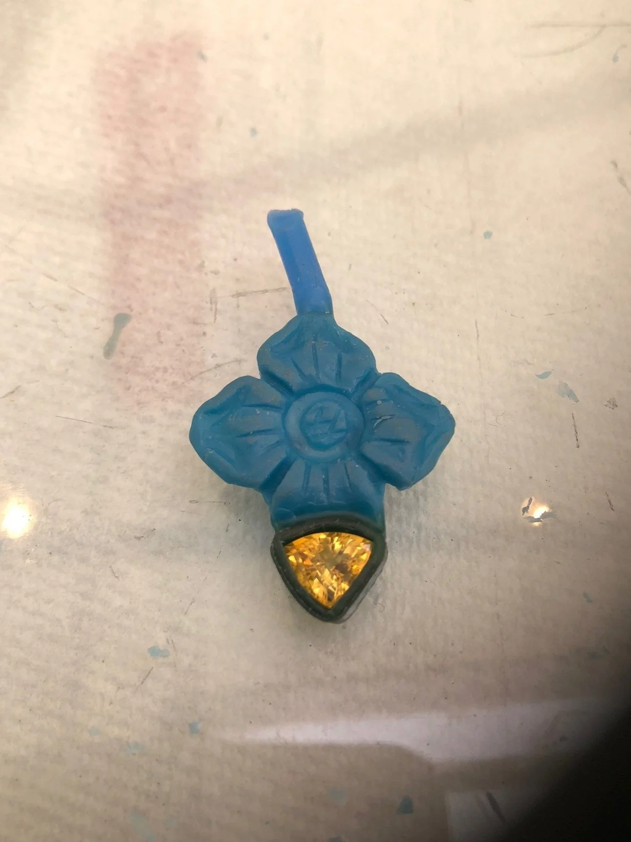 We cut off the sprues and grind down the leftover nub. Take care of any imperfections with a medium grit wheel on a flex shaft. Do a series of polishing and possibly add an oxidation or jump ring that the piece needs. It gets a final polish and is ready to wear when that is all finished!