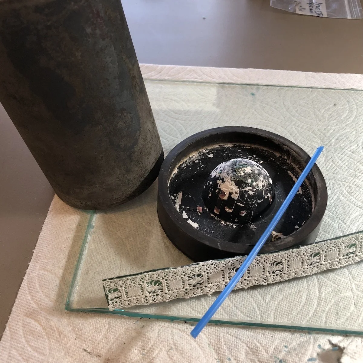 Mix water, investment powder, and vacuum/debubble for 2 minutes. Pour investment into the flask, submerging the wax tree. Again vacuum/ debunked the investment in the flask this time. The investment will dry and harden. Once hardened, it is ready to go into the kiln.