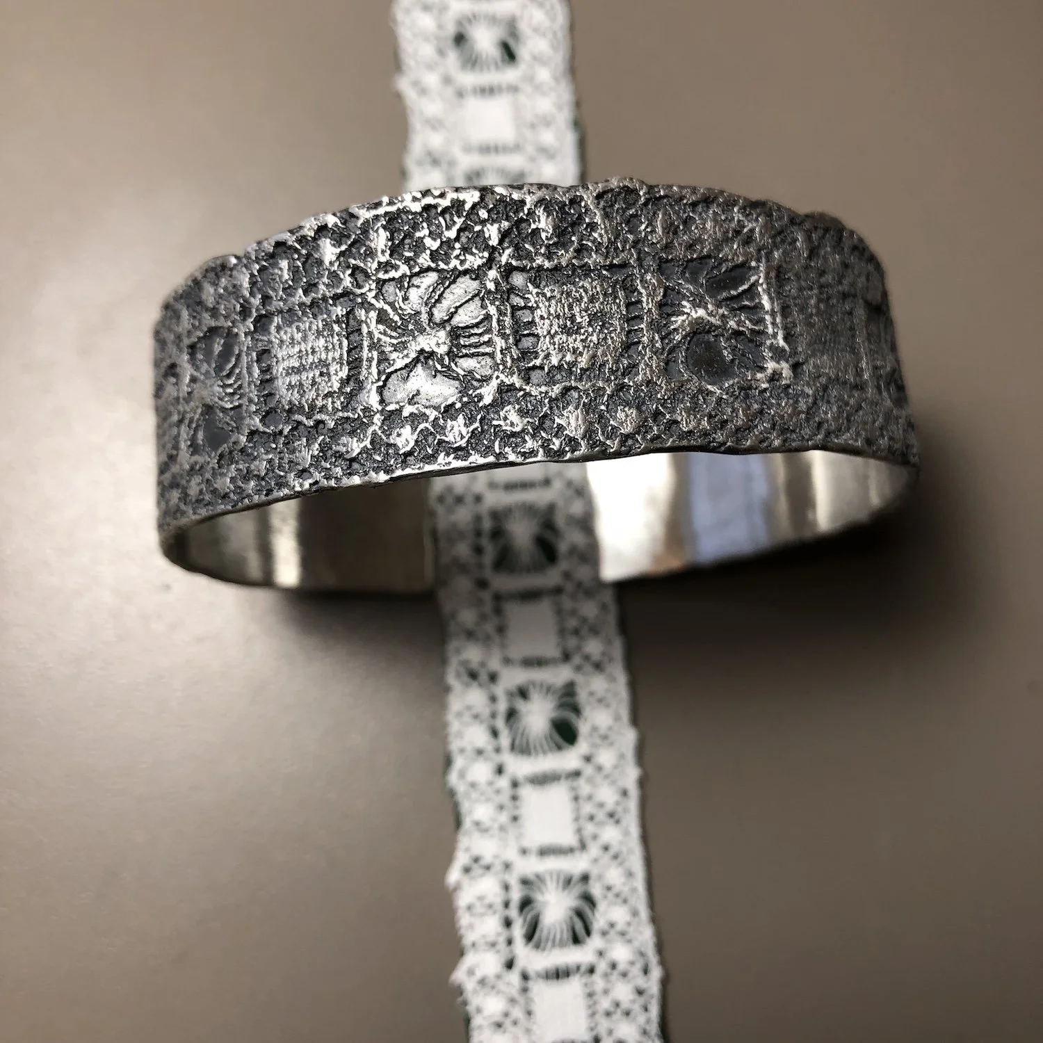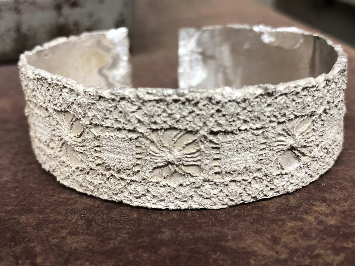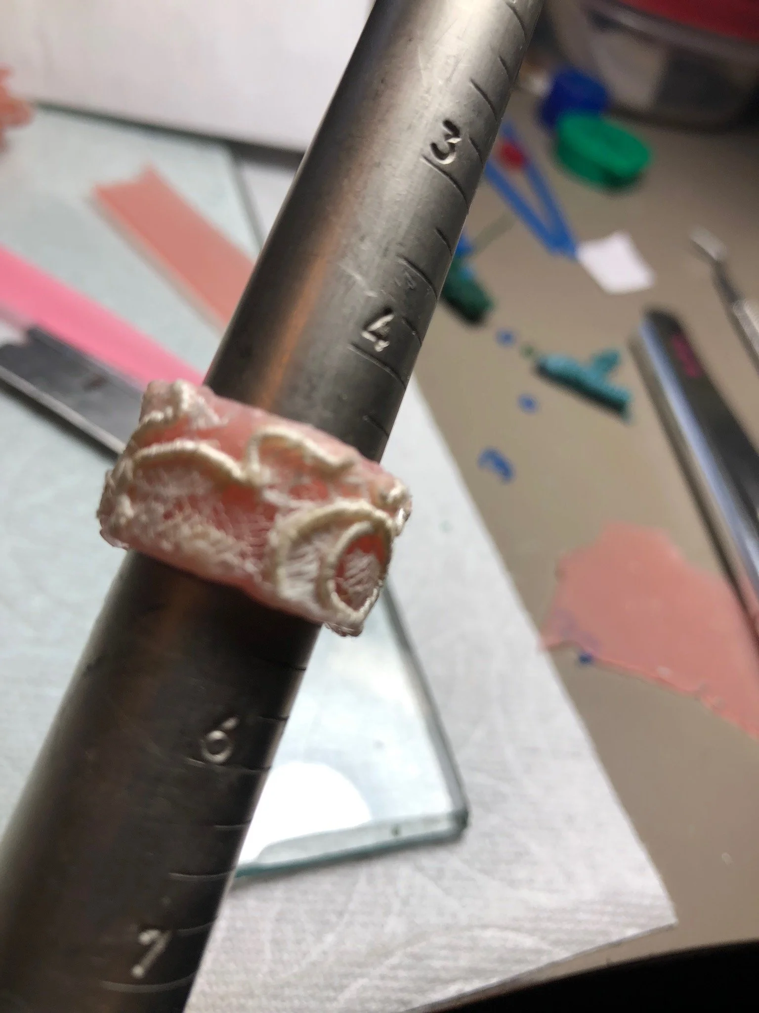 Create a wax model of a new piece of jewelry, then add sprues to the piece(s), creating a tree. Secure the tree to a rubber base. Fit metal cylinder/flask to fit into the rubber base with the wax tree.
